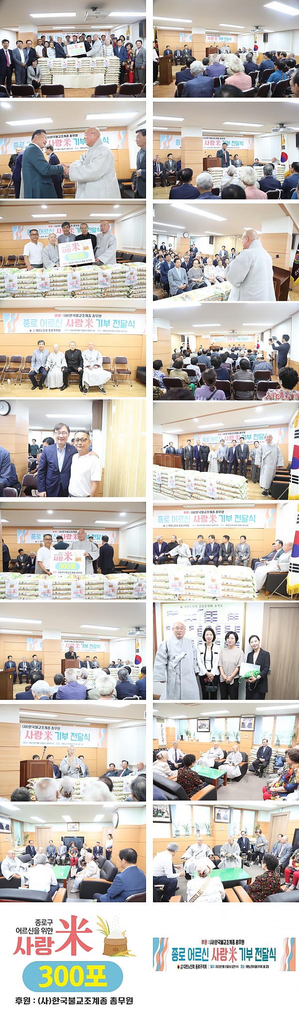 (사)한국불교조계종 총무원은 13일 대한노인회 종로지회 회관에서 지역기관장 및 종단관계자 등 노인회 회원 100여명이 동참한 가운데 종로 어르신 사랑의 백미(米) 전달식을 봉행했다.
