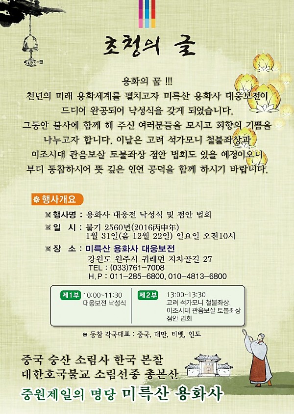 용화사 대웅전 낙성식 및 점안법회 봉행 안내 작성자 한민련 작성일16-01-27 14:09 조회3,561회 댓글0건 이전글 다음글 목록 본문 용화사 대웅전 낙성식 및 점안법회 봉행 안내 댓글목록 등록된 댓글이 없습니다. 이전글 다음글 목록