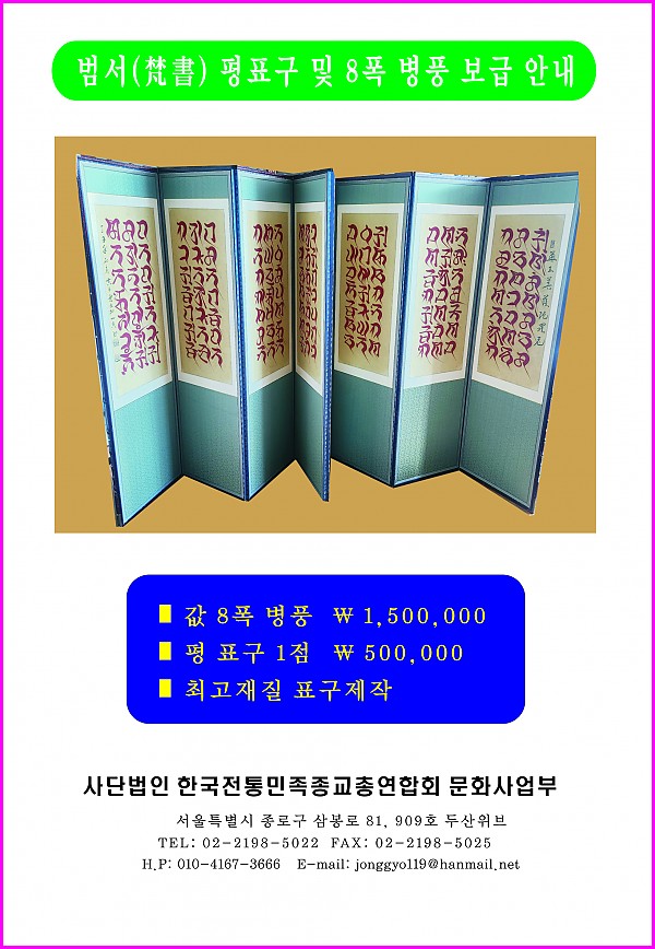 범서(梵書) 평표구 및 8폭 병풍 보급 안내 작성자 한민련 작성일24-02-15 17:47 조회506회 댓글0건 이전글 다음글 목록 본문 범서(梵書) 평표구 및 8폭 병풍 보급 안내 댓글목록 등록된 댓글이 없습니다. 이전글 다음글 목록