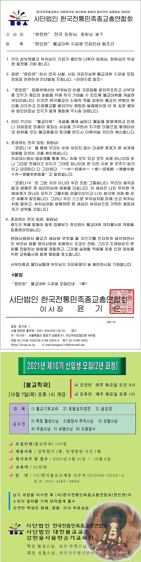 “한민련” 불교대학 수강생 모집안내 협조건 작성자 한민련 작성일21-09-15 13:53 조회681회 댓글0건 이전글 다음글 목록 본문 “한민련” 불교대학 수강생 모집안내 협조건 댓글목록 등록된 댓글이 없습니다. 이전글 다음글 목록